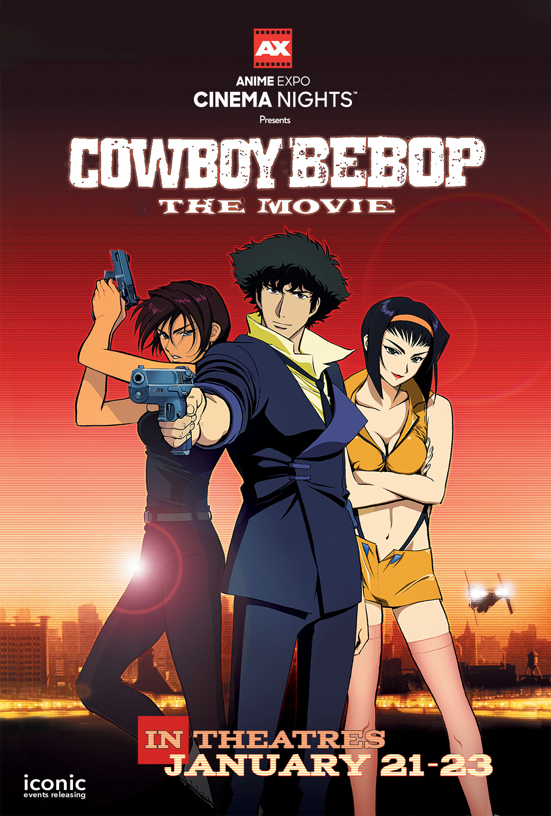 Anime Expo Cinema Nights presents COWBOY BEBOP: THE MOVIE. Caught up in a world of dreams, lost in the cruelty of reality. What should have been an easy bounty turns into biological war after a terrorist gets hold of a deadly virus. Drawn in by the pretty price on the mastermind's head, Spike and the Bebop crew are ready to collect a much-needed reward. Unfortunately, the gang's about to find themselves in more trouble than money when the terrorist threatens to unleash the virus on Halloween--effectively killing everyone on Mars. With little time and leads that seem more dreamy than helpful, they'll have to use their own bag of tricks to stop a dangerous plot.
