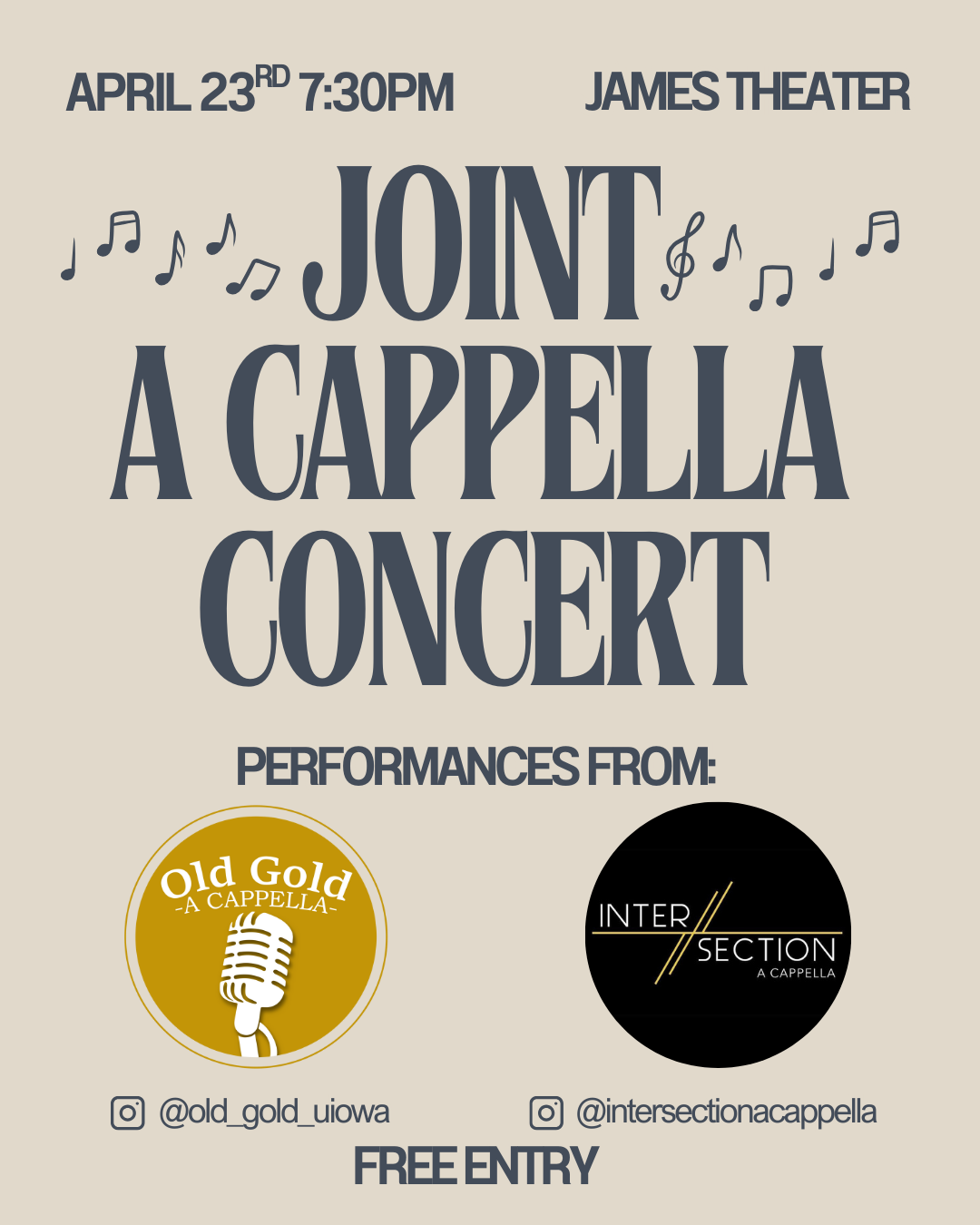 "Join Old Gold A Cappella and Intersection A Cappella for an unforgettable evening of vocal talent and musical collaboration. Old Gold brings dynamic mixed-voice arrangements and a spirited stage presence, while Intersection, the all tenor-bass group on campus, is known for its bold sound and creative flair. Together, they’re joining forces for an evening packed with powerful vocals, fun mashups, and an unforgettable experience.