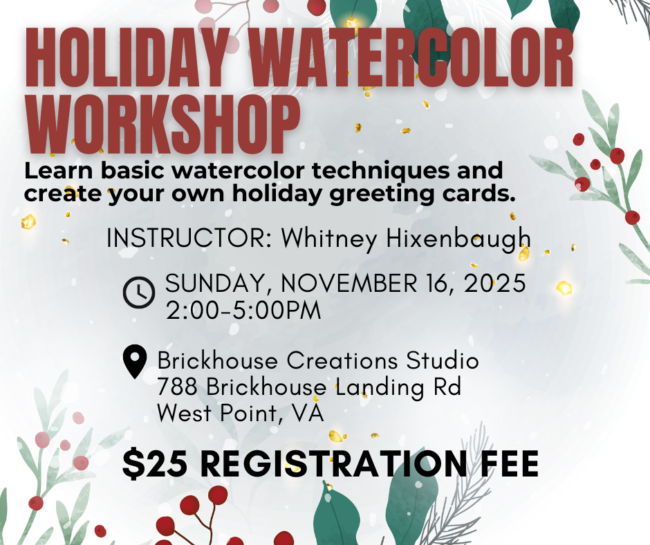 Let's get in the holiday spirit together! Join our instructor, Whitney Hixenbaugh, at her studio to learn watercolor tehcniques to design and create your very own holiday greeting cards. No experience needed and all supplies are provided.