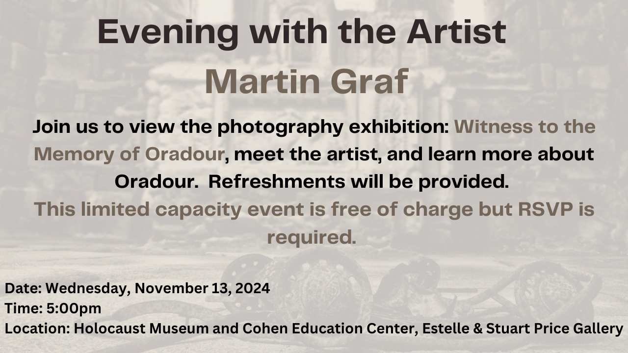 to view and discuss his photography exhibition: Witness to the Memory of Oradour - on display at the museum through mid-December in the Estelle & Stuart Price Gallery.