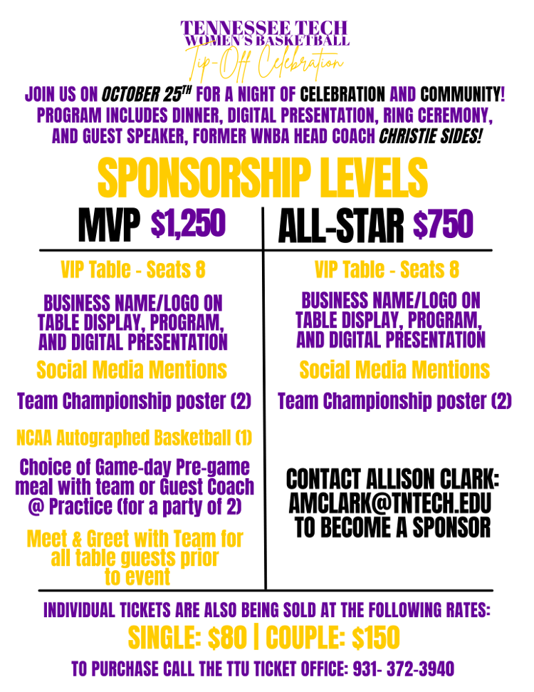 Join us for a memorable evening as we celebrate the beginning of a new season and honor the remarkable achievements of our 2024-25 OVC Champions. It will be a night filled with connection, celebration, and pride in all that makes Tennessee Tech Women's Basketball so special. We look forward to sharing this meaningful occasion with you!