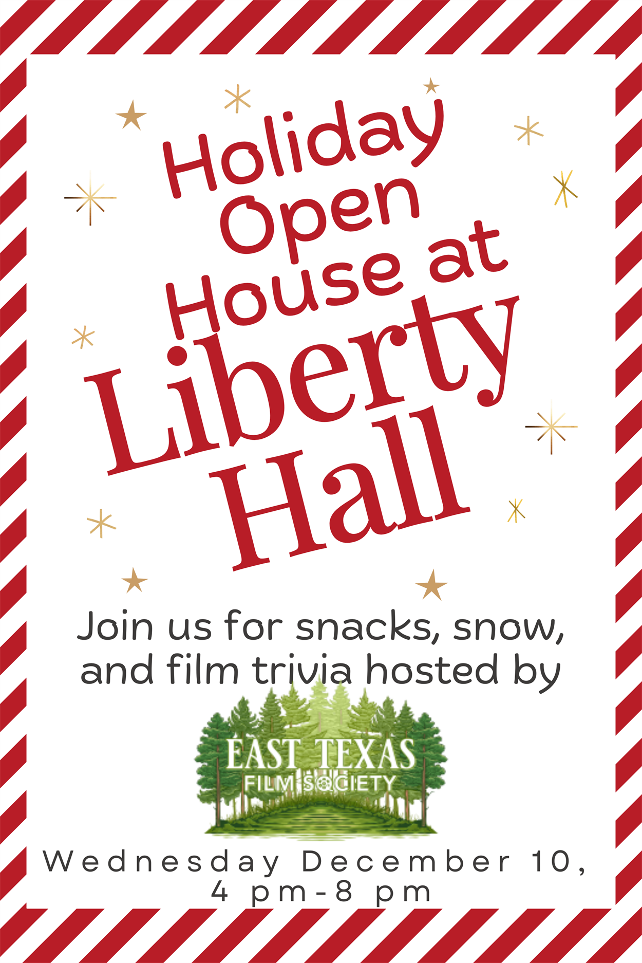 Come join in the Holiday magic at the historic Liberty Hall Theater! Liberty Hall will be open from 4 pm- 8 pm on Wednesday December 10th for Downtown's Holiday Open House! There will be snacks, trivia and maybe even a little snow!