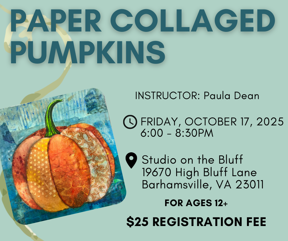 Celebrate the season with a guided evening of collage art. In this workshop, participants will create a one-of-a-kind pumpkin composition using handpainted and textured papers. Participants will explore layering, color harmony, and design while assembling a custom piece of artwork that reflects the richness of autumn.