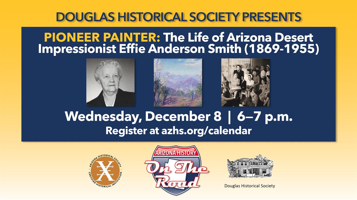 The largest public display of paintings by early Arizona desert impressionist Effie Anderson Smith (aka Mrs. A.Y. Smith) is in the Douglas-Williams House Museum, managed by the Douglas Historical Society. Known during her mature years as "Dean of Arizona Women Artists," Effie painted hundreds of canvases 'en plein air,' which she displayed and sold while talking at Arizona's women's clubs, and at galleries from Los Angelesto the Grand Canyon, in Phoenix, Tucson and El Paso, and in Washington DC, Philadelphia and New York during the 1930s. This will be a lively presentation rich in photos and images of Effie's paintings, accompanied by brief anecdotes of her life in the mining camp of Pearce and the colorful Arizona personalities she associated with as Arizona's Pioneer Painter.