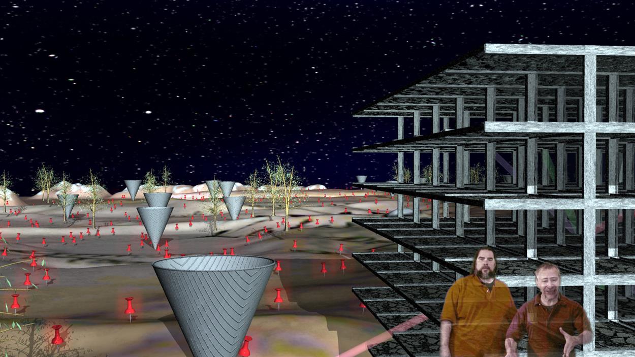 Seemingly stock imagery supports a sincere inquiry into shared human thought and culture. Meticulous 3D animation is made up of purposely generic elements forming a Web 1.0 arcade of human thought. An inimitable screen duo mines landscapes of the collective unconscious. Followed by Q&A with director David Finkelstein.