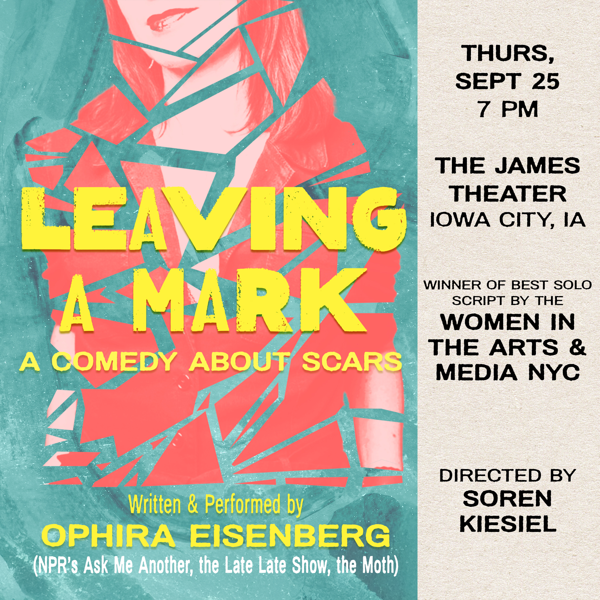 Leaving a Mark: A Comedy About Scars, written and performed by Ophira Eisenberg, is a darkly funny, deeply personal look at the scars -both literal and metaphorical- that shape us. From childhood mishaps to near-fatal accidents, botched first loves and a battle with breast cancer, Ophira weaves together a survival tale that’s equal parts stand-up and storytelling. It’s about resilience, humor in the face of pain, and ultimately, the absurdity of being human. This dynamic show changes each night with audience interaction via a scar competition, "Scar Wars" (yes, there's a prize!). Leaving a Mark is a joyful celebration of imperfection and a show that leaves people laughing, reflecting, and maybe even showing off their own scars a little more proudly.