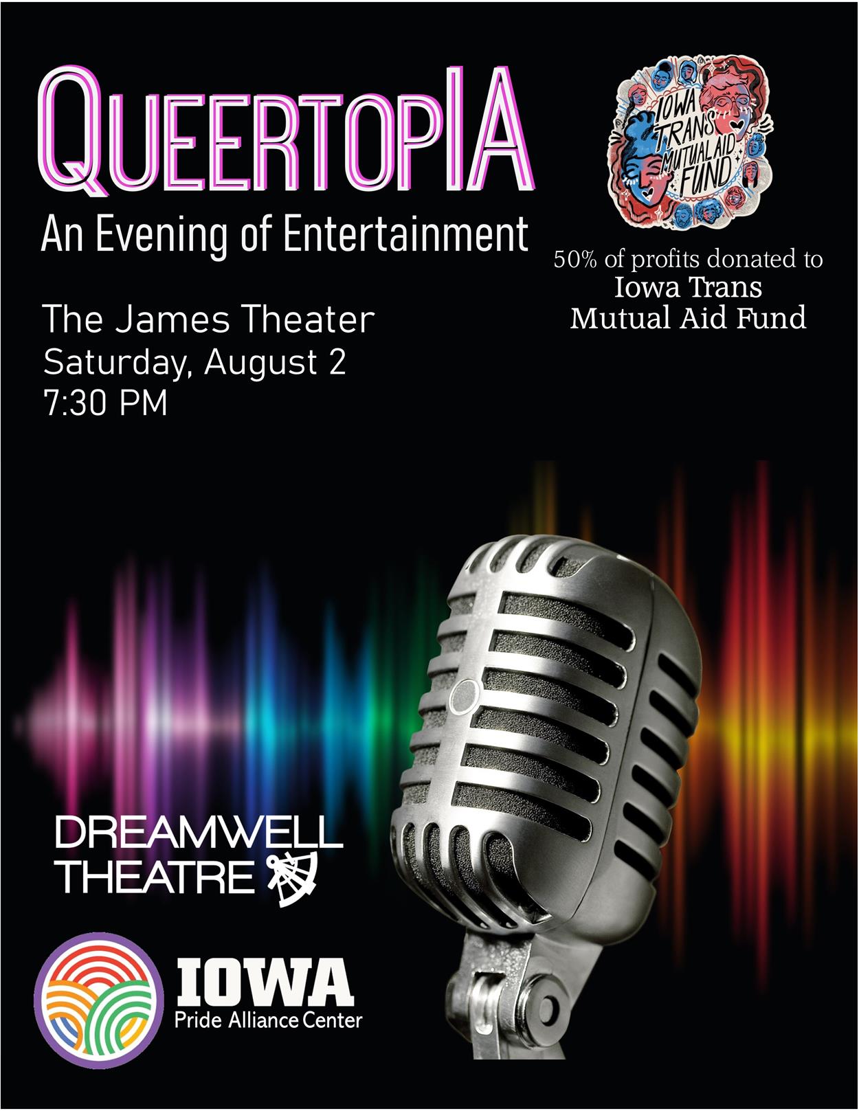 Dreamwell Theatre and Pride Alliance Center are co-hosting QueertopIA 2025! Join your neighbors and friends in celebration and reflection, while basking in community support. Fifty percent of the proceeds from this evening will be donated to the Iowa Trans Mutual Aid Fund.