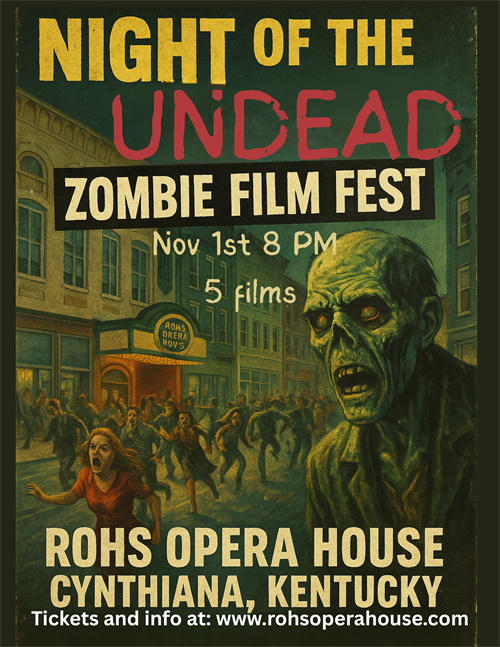 Join us for an all night Zombie Fest. Cynthiana (the birthplace of the Walking Dead) is the perfect location for the first ever Night of the Undead Zombie Film Festival. 5 featured zombie films from mainstream films to B movie reels will play throughout the night for a night of terror in the historic Rohs Opera House (the most haunted theater in Kentucky).