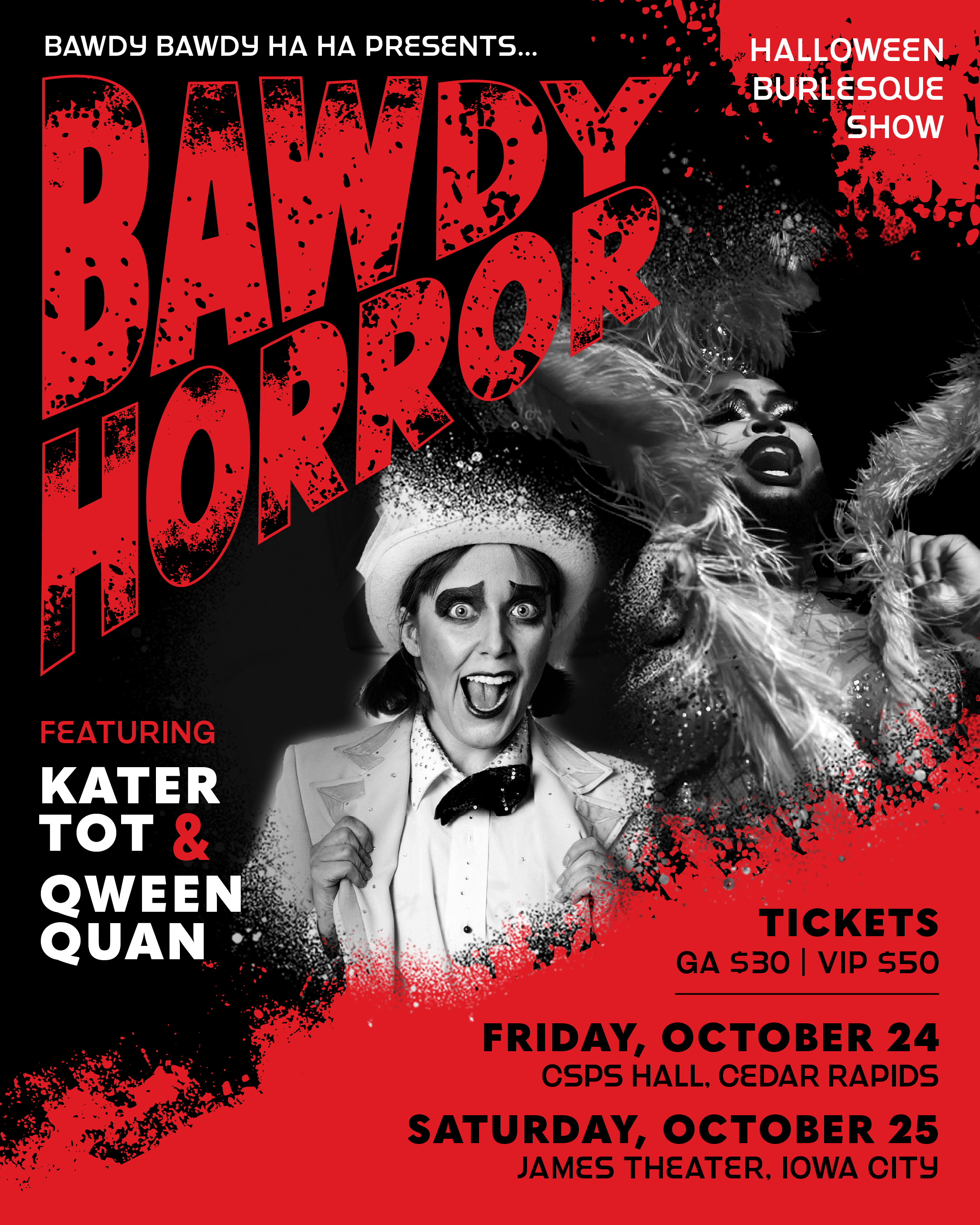 It's glamorous, it's gorey, it's BAWDY HORROR, Bawdy Bawdy Ha Ha's Halloween burlesque & variety show! Headlined by the number one most influential burlesque performer in the world, Qween Quan from New Orleans, and long-time Bawdy favorite & comedy genius Kater Tot, this show will make your toes curl in more ways than one! Doors 7PM, show 8PM. 18+.
