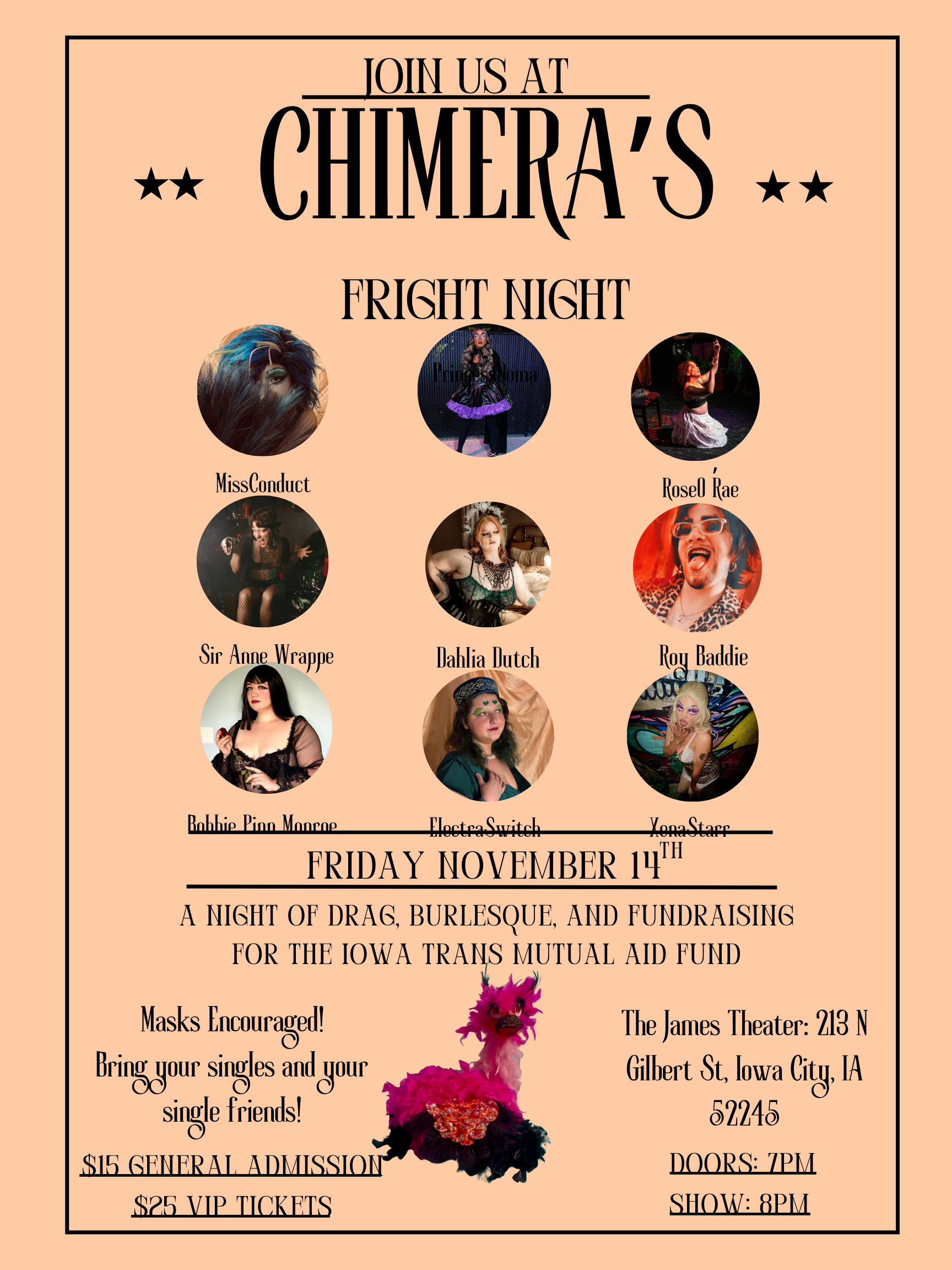 Chimera's Fright Night is a drag and burlesque fundraiser show for the Iowa Trans Mutual Aid Fund. With an array of talented performers, gorgeous raffle prizes, and a costume contest this will be a night to remember!