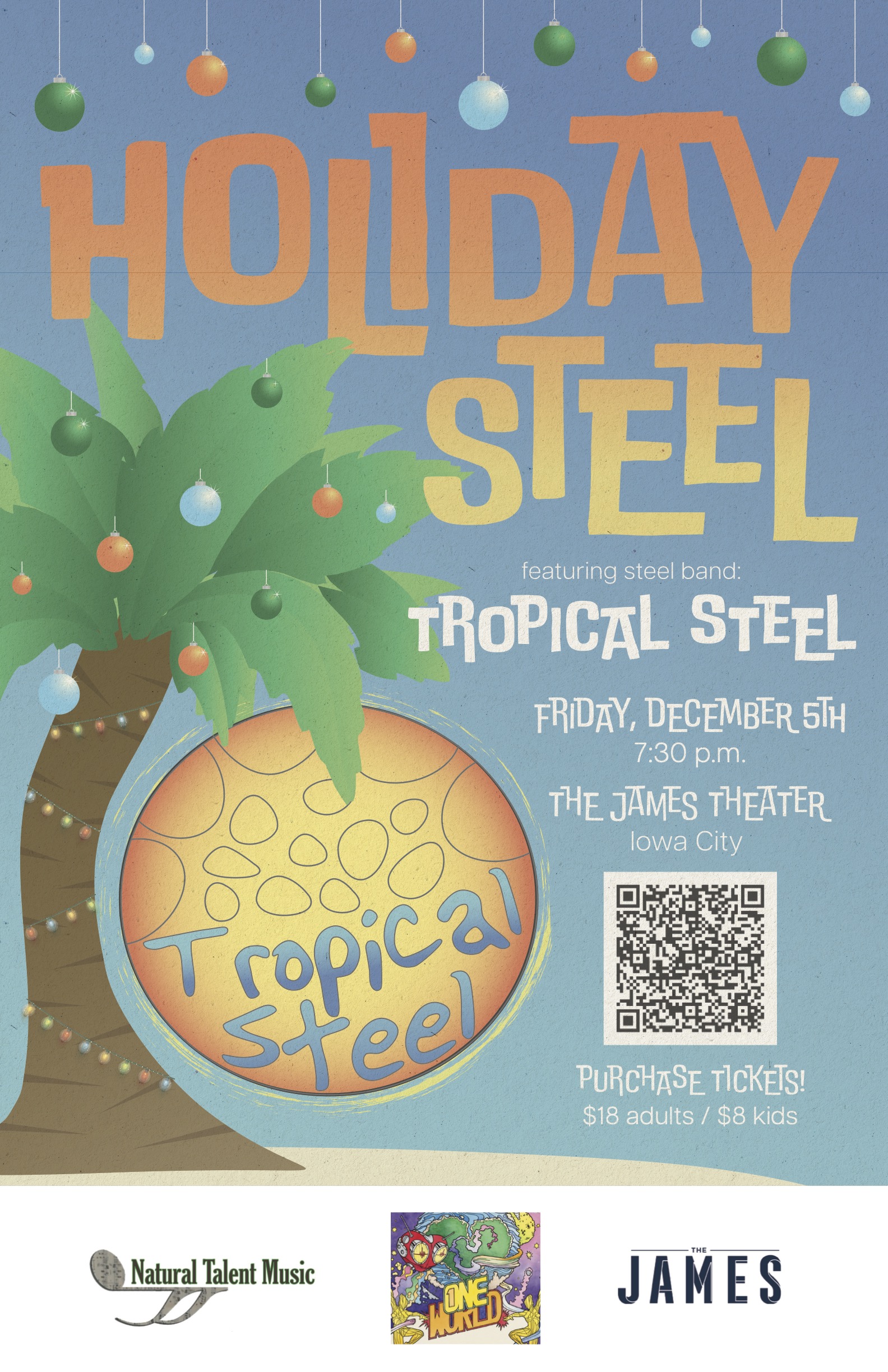 Join us for a Caribbean-flavored celebration of the holiday season with Des Moines' premier steel band, Tropical Steel. Performing their “sweet island sounds” around Iowa since 1997, this orchestra of talented multi-instrumentalists has been featured at numerous festivals and events including the World Food & Music Festival, Special Olympics USA Games, and the Iowa State Fair. Bringing their signature Caribbean and Latin vibes, Tropical Steel will warm up the holidays with unique versions of traditional Christmas carols, favorite holiday tunes from various cultures, and songs of celebration and peace. Expect a family-friendly, joyous explosion of sound and color that will leave you astounded and full of holiday cheer as only the steel pan can. Don’t be surprised if the limbo pole makes an appearance and your family gets invited down to check out the instruments!