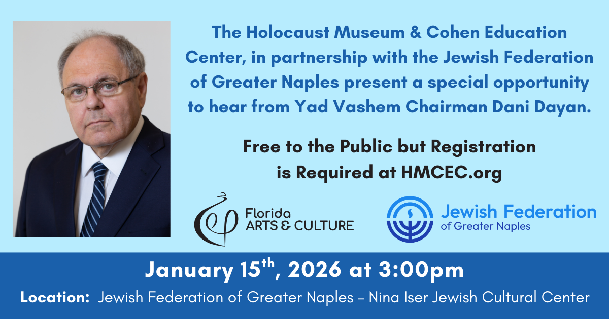 The Holocaust Museum & Cohen Education Center, in partnership with the Jewish Federation of Greater Naples present a special opportunity to hear from Yad Vashem Chairman Dani Dayan.