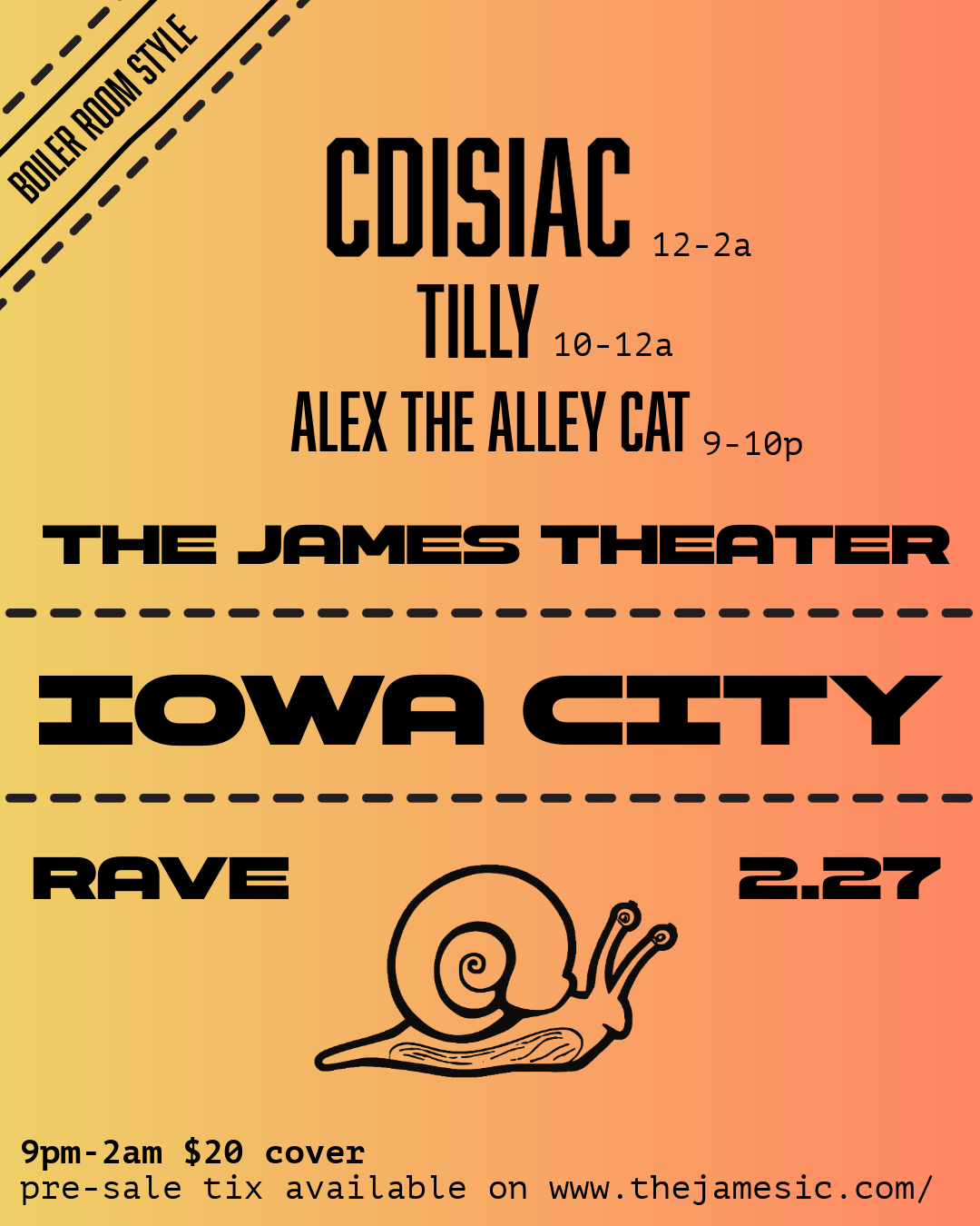 SloMo Media is proud to present our inaugural event: an intimate, boiler room-style showcase celebrating the heartbeat of local electronic music. SNAIL BOX at the James Theater brings together three Iowa DJs for a night of unfiltered energy, heavy bass, and more.