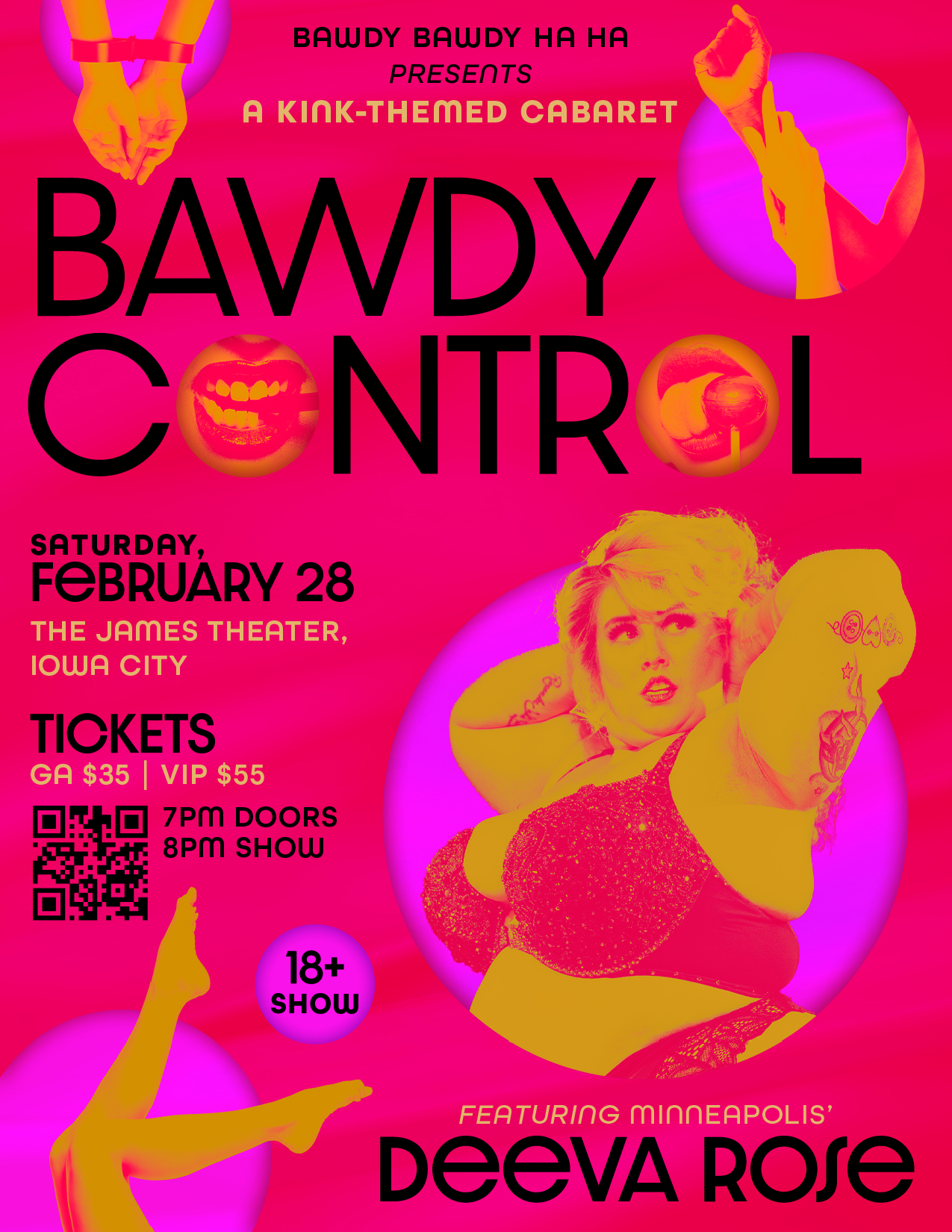 Join Bawdy Bawdy Ha Ha for our first ever kink-themed show, headlined by the Best Chest in the Midwest, Deeva Rose from Minneapolis! We're exploring every inch of what "fetish" has to offer, from the daring and dominting to the slinky and submissive... and plenty of ridiculous Bawdy twists. Come experience the new meaning of BDSM (Bawdy Delivers Show Magic? Bawdy Drives Showgoers Mad? Bawdy's Delicious Succulent Meat?). Our host Varla special-requested this theme, so only the gods of revelry know what's going to happen -- Dionysus, help us all! Doors 7PM, show 8PM. 18+. VIP tickets include front-row cabaret table seating, special host and performer interaction, and a free, professionally-edited photo by Madame Ether Photography!
