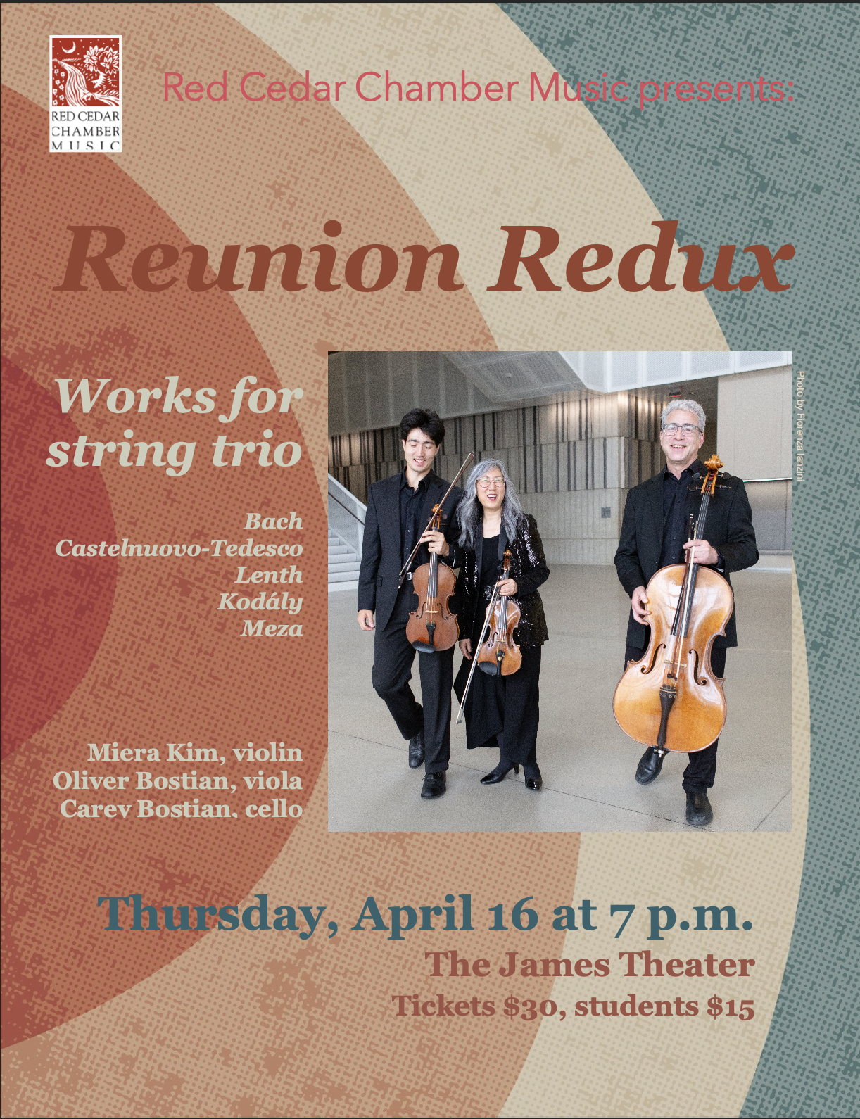 Red Cedar Chamber Music’s Directors and core ensemble, violinist Miera Kim and cellist Carey Bostian, will be joined by violist Oliver Bostian to present Reunion Redux, a program of music for string trio.