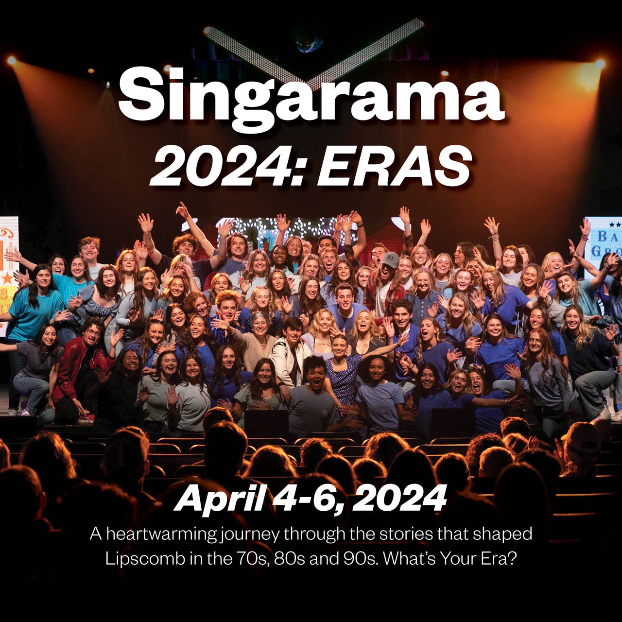 Step back in time and relive the magic of the 70s, 80s, and 90s at Singarama 2024: ERAS! Lipscomb University invites you to a spectacular journey through the iconic decades that shaped a generation. Join us for a mesmerizing showcase of talent, creativity, and passion as our students bring these eras to life on stage. Experience the nostalgia, groove to the music, and be captivated by the captivating performances, all under one roof. Don't miss this unforgettable celebration of artistry and camaraderie. Secure your tickets now for a night of entertainment that will transport you through time and leave you with cherished memories. Get ready to embark on a musical adventure – What's your Era?