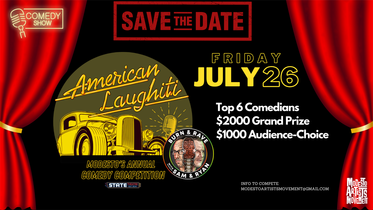 From the small town that brought you George Lucas and American Graffiti comes the coolest stand-up comedy show of the summer: American Laughiti: Modesto’s Annual Comedy Competition on Friday, July 26, 2024, featuring a $2000 Grand Prize and a $1000 Audience Choice Award!