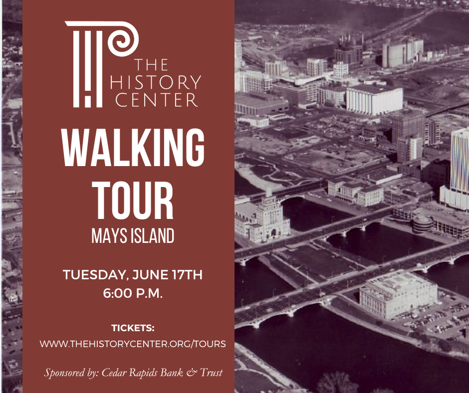Showcasing the unique Mays Island Historic District. Learn about the early history of Mays Island and how Cedar Rapids transformed it into the only island government center in North and South America. Then experience the history of what was once known as “Commercial Street”. A walk along several blocks of First Street SE will reveal details about the ?first downtown retail buildings before the Civil War, the construction of landmark “skyscrapers” and a closer look at surviving historic warehouse structures including the Smulekoff and Hach Buildings.