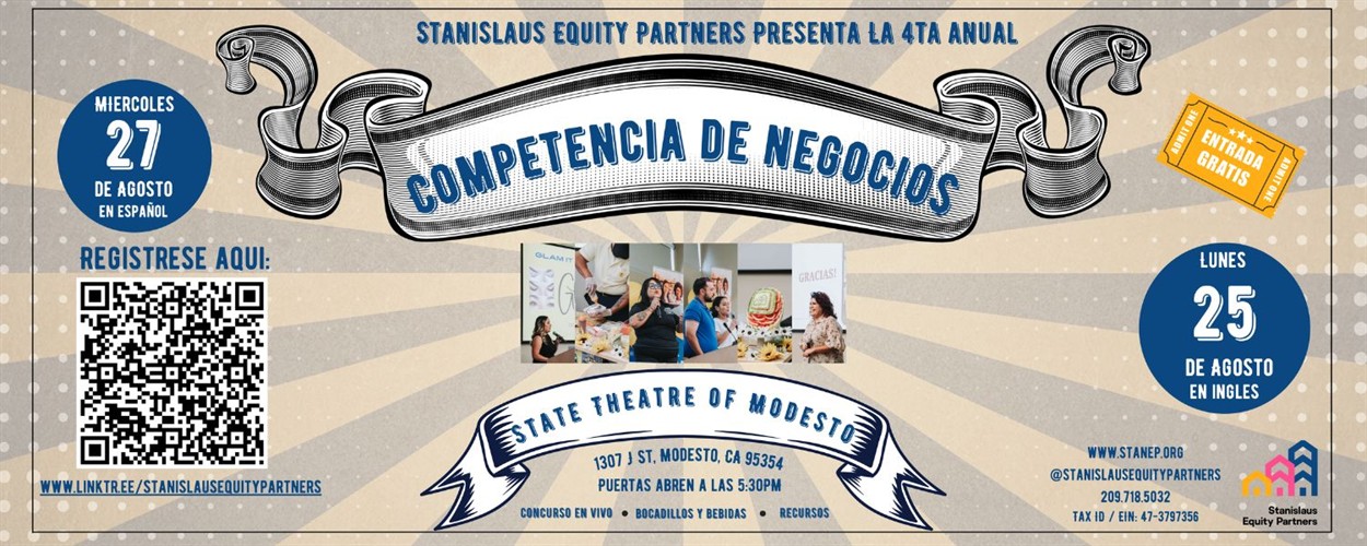 proporciona el espacio para que los emprendedores y microempresarios del Condado de Stanislaus se reúnan para aprender de expertos en negocios, compartir sus experiencias empresariales entre sí y construir comunidad. Los miembros del grupo que completan el curso y cumplen los requisitos son invitados a una competencia de presentación de negocio. Durante esta competencia, pueden compartir sus ideas y/o necesidades comerciales para tener la oportunidad de ganar fondos para ayudar a su negocio.