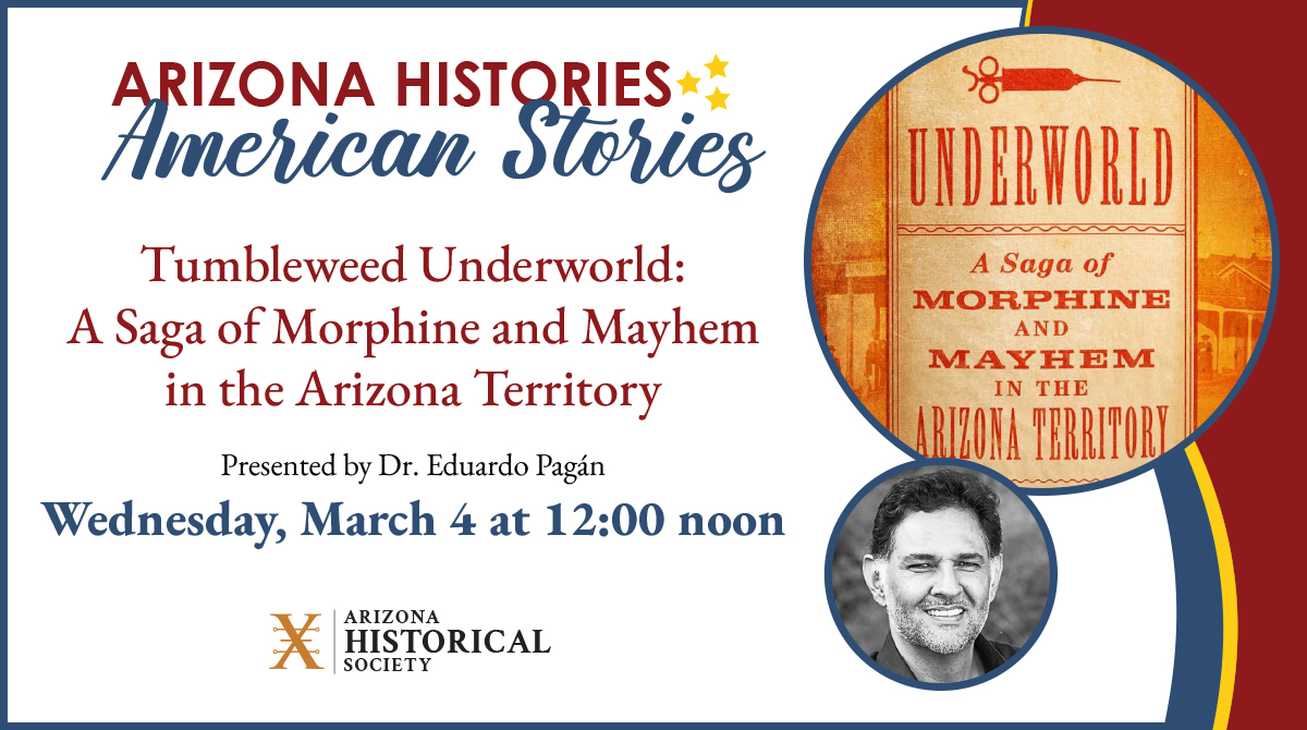 Join the Arizona Historical Society and Dr. Eduardo Pagán for Tumbleweed Underworld: A Saga of Morphine and Mayhem in the Arizona Territory, an installment of the Arizona Histories, American Stories series, celebrating Arizona’s role in 250 years of American history.