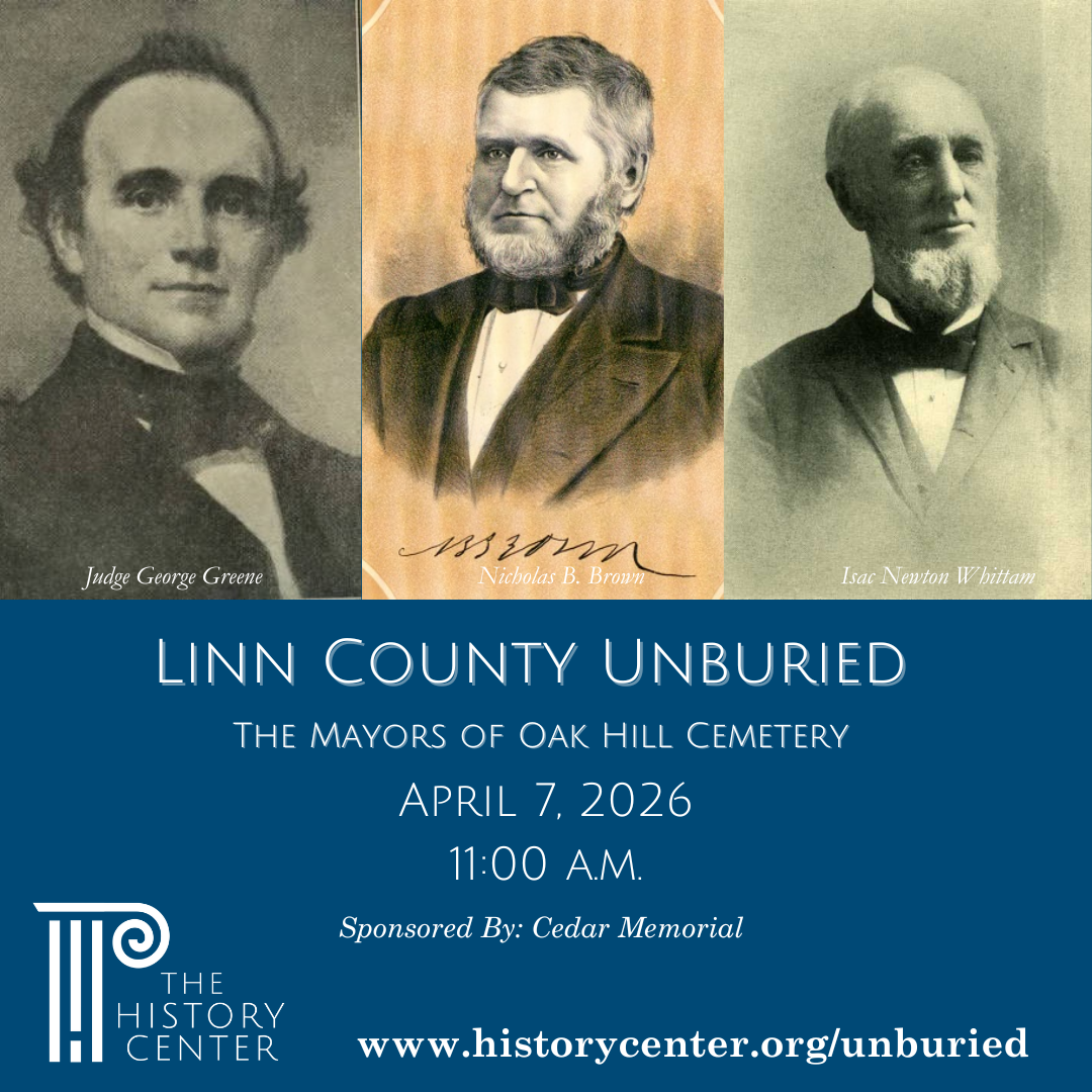 Discover the lives and legacies of Cedar Rapids’ earliest leaders—mayors whose stories now rest at Oak Hill Cemetery. Beginning with the city’s first chartered mayor in 1856, Isaac Newton Whittam, this presentation highlights the men who helped shape Cedar Rapids through their roles as merchants, builders, lawyers, craftsmen, and community developers.More than their terms in office, these mayors influenced the city’s growth through their businesses, civic involvement, and vision for the future. Join us for a fascinating look at how this remarkable group of individuals left a lasting mark on Cedar Rapids, both in life and in their final resting place at Oak Hill Cemetery.